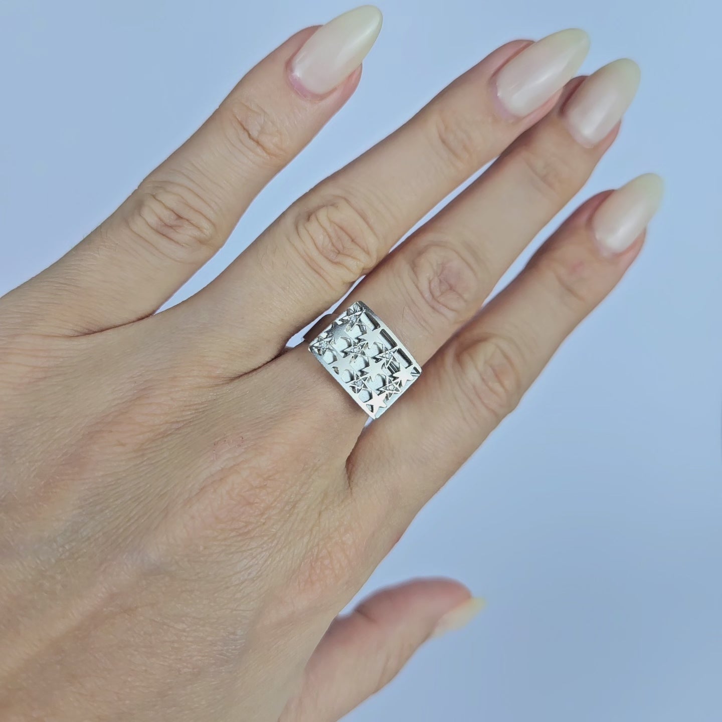 Com superfície retangular em relevo texturizado, este anel em ouro branco 18k traz uma constelação de estrelas estilizadas com 6 pontos de diamantes que se destacam em alto e baixo relevo. O design geométrico e moderno remete ao infinito do céu noturno, criando uma peça imponente e de personalidade forte. Ideal para quem busca um visual ousado e singular, mantendo a sofisticação clássica do ouro.