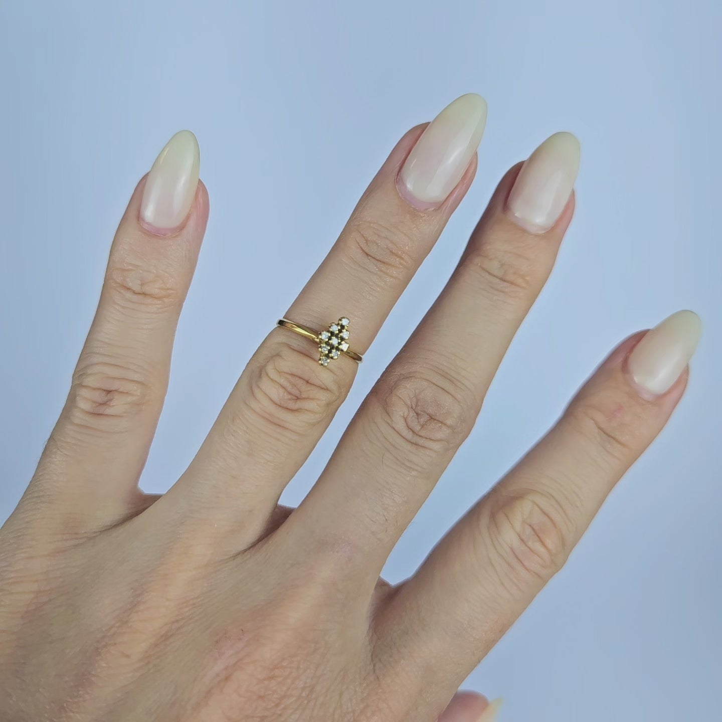 Inspirado na delicadeza das joias florais, este anel apresenta uma composição de diamantes em arranjo marquise, criando um efeito de botão de flor elevado. O aro fino e polido realça a leveza da peça, enquanto a cravação minuciosa dá brilho em todos os ângulos.