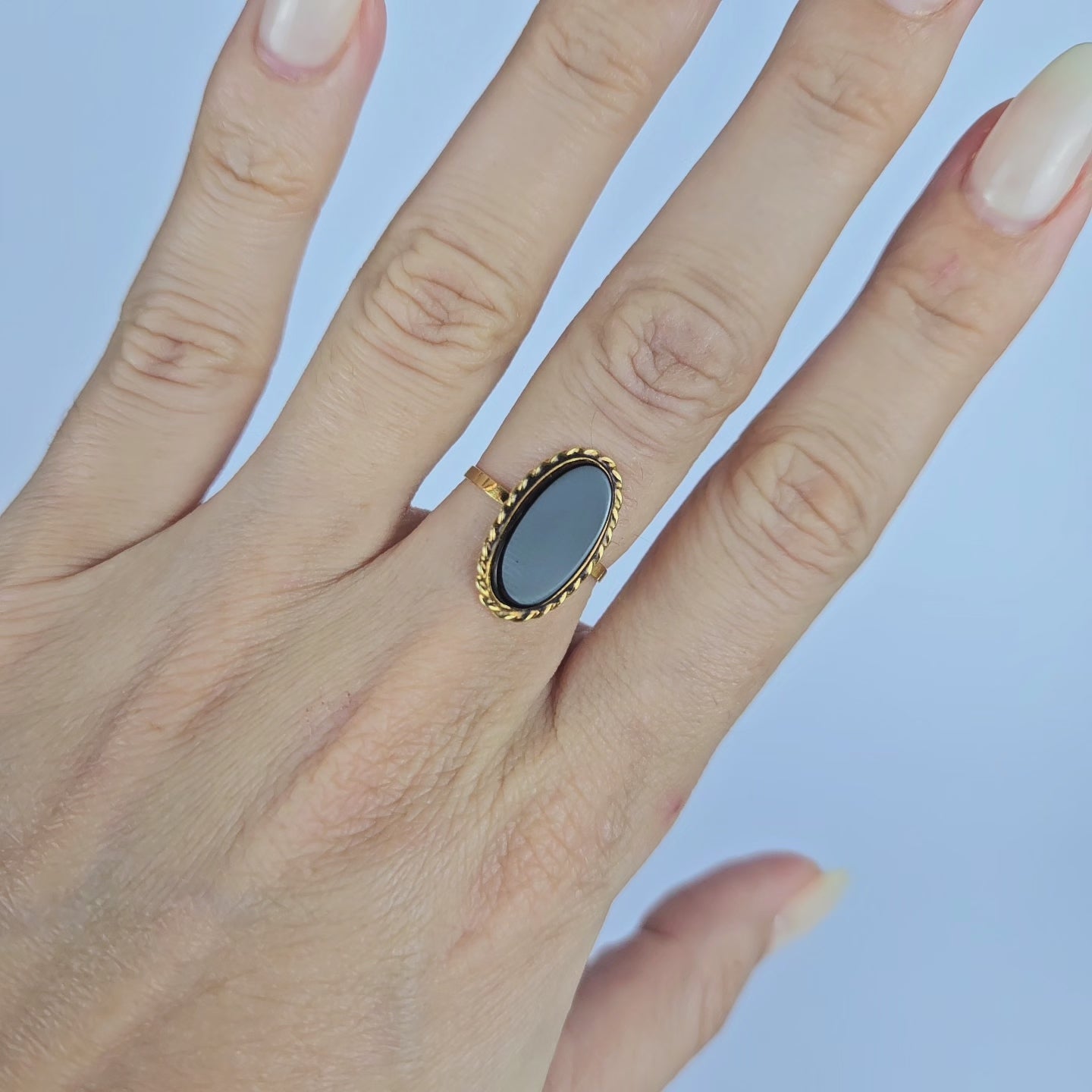 Peça de presença marcante, este anel exibe um cabochão oval de ônix negro polido, que domina o design com sua superfície profunda e reflexos sutis. A pedra é moldurada por uma borda trabalhada em torção delicada, que acrescenta textura e movimento à composição. O aro fino e elegante mantém o foco na gema, criando um equilíbrio entre imponência e leveza.