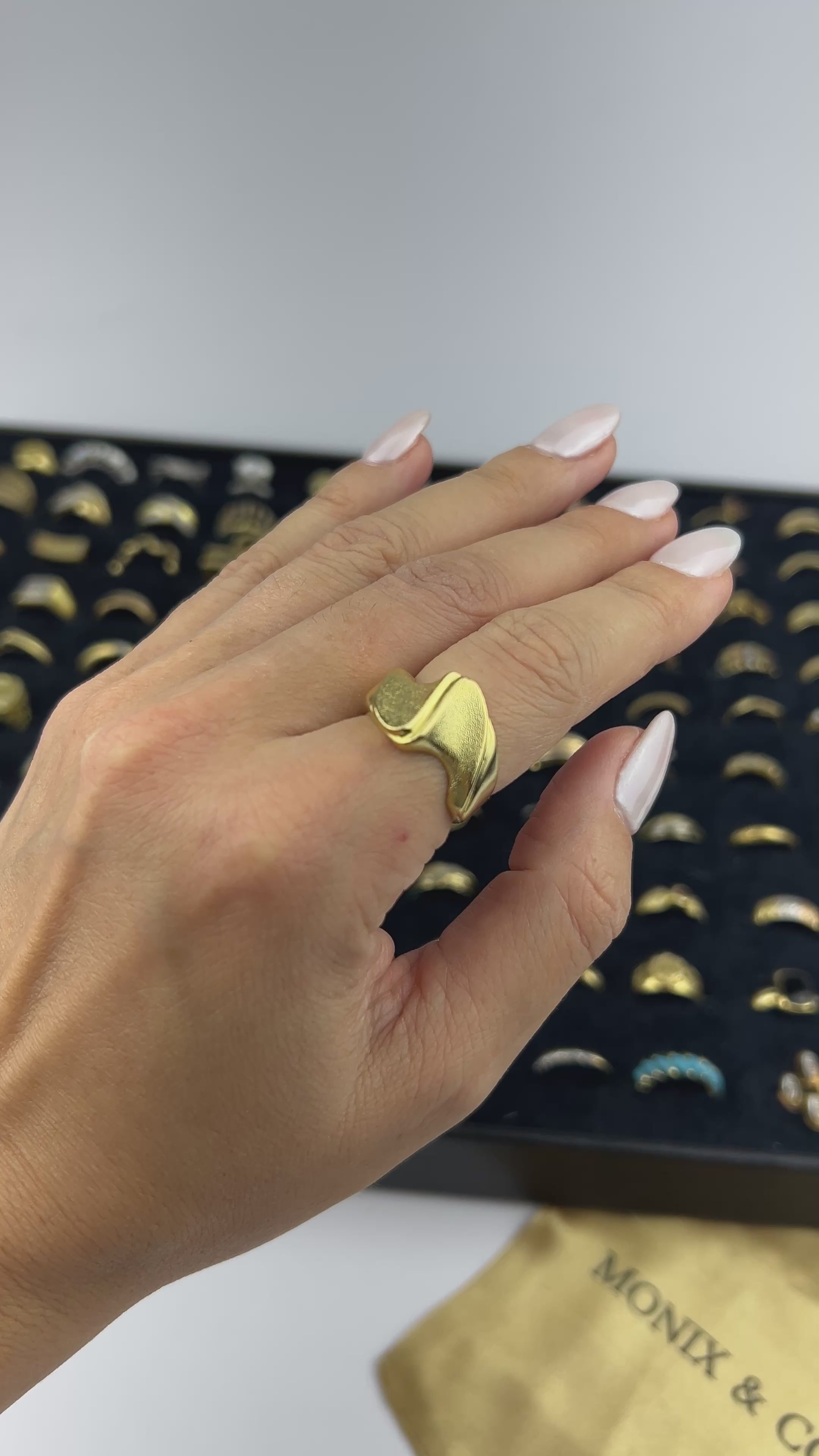 Anel escultural em ouro amarelo 18k com estrutura ampla e formas fluidas que remetem a uma onda ou dobra em tecido. O acabamento texturizado fosco em toda a superfície contrasta com a linha polida que percorre o centro, criando uma divisão sutil e elegante, como uma fronteira entre movimento e matéria.