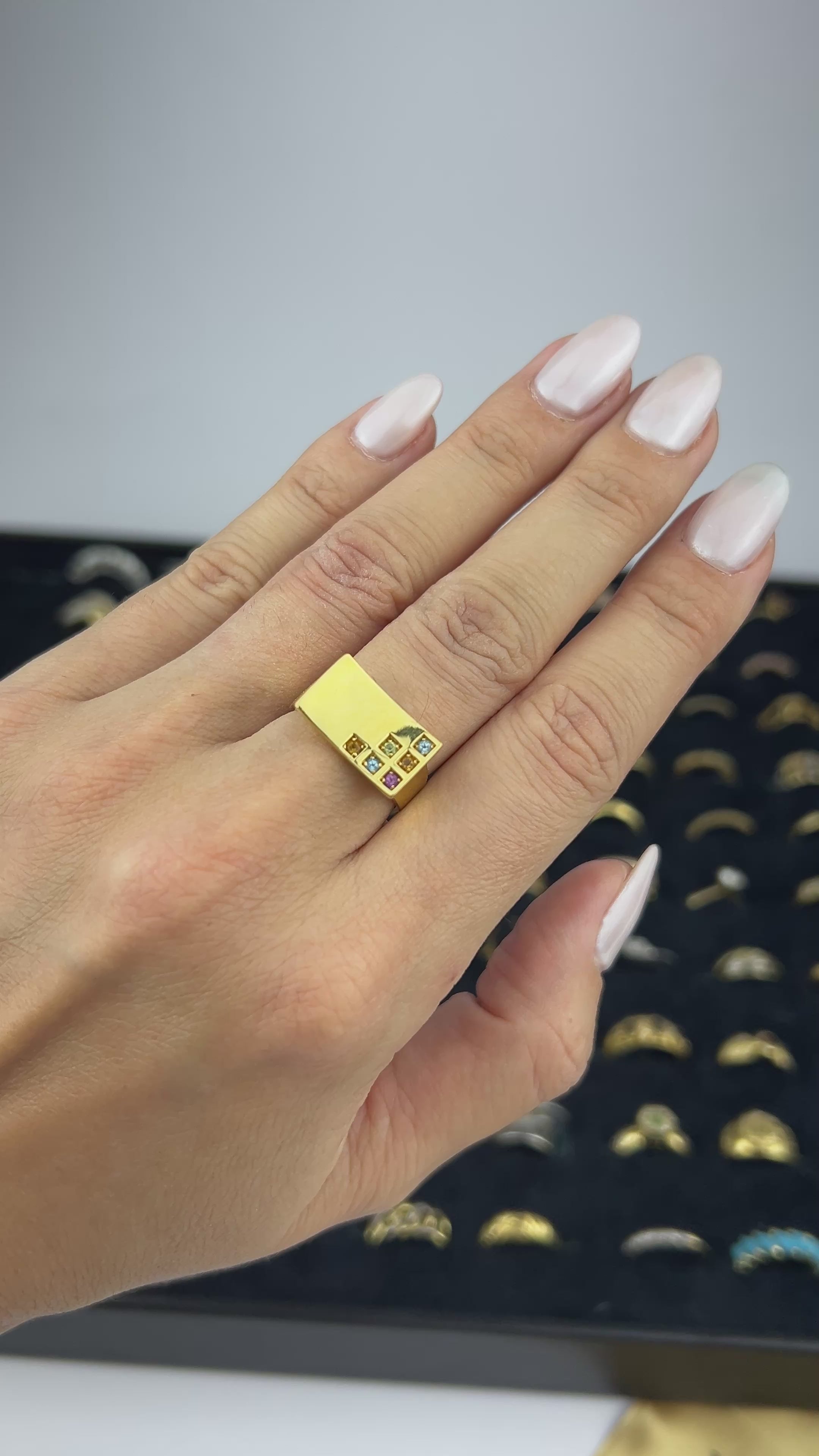 Anel contemporâneo em ouro amarelo 18k com topo plano e recorte assimétrico, criando um visual limpo, ousado e arquitetônico. No canto esquerdo da superfície, seis gemas coloridas em lapidação quadrada estão dispostas em um padrão geométrico sutil, como pixels preciosos que pontuam a peça com luz e cor.