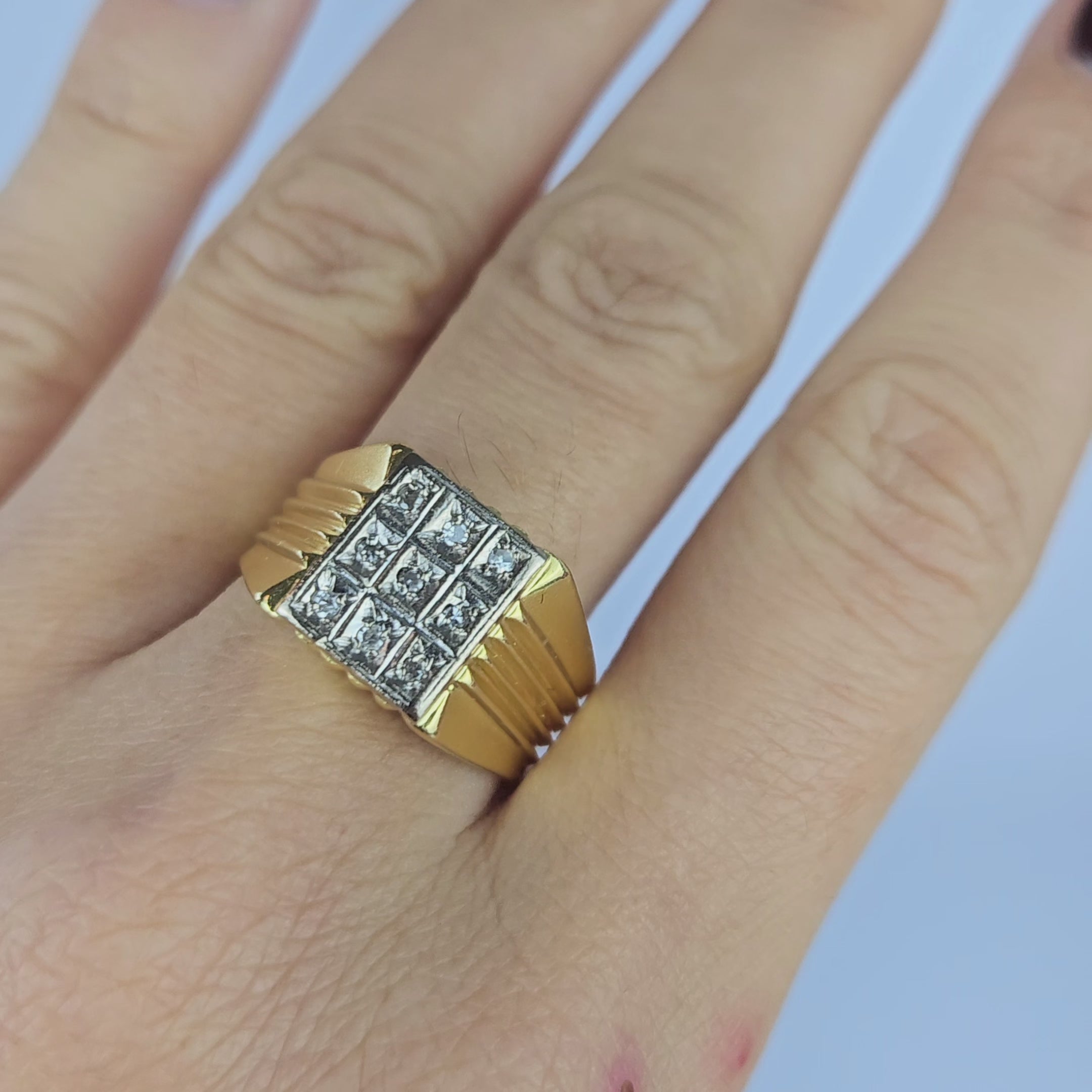 Anel em ouro amarelo 18k com laterais facetadas em linhas diagonais e topo retangular em ouro branco, cravejado com nove diamantes dispostos em padrão quadriculado 3x3. A simetria das cravações, combinada ao brilho intenso das pedras e ao contraste entre os metais, confere à peça um visual imponente e refinado.
