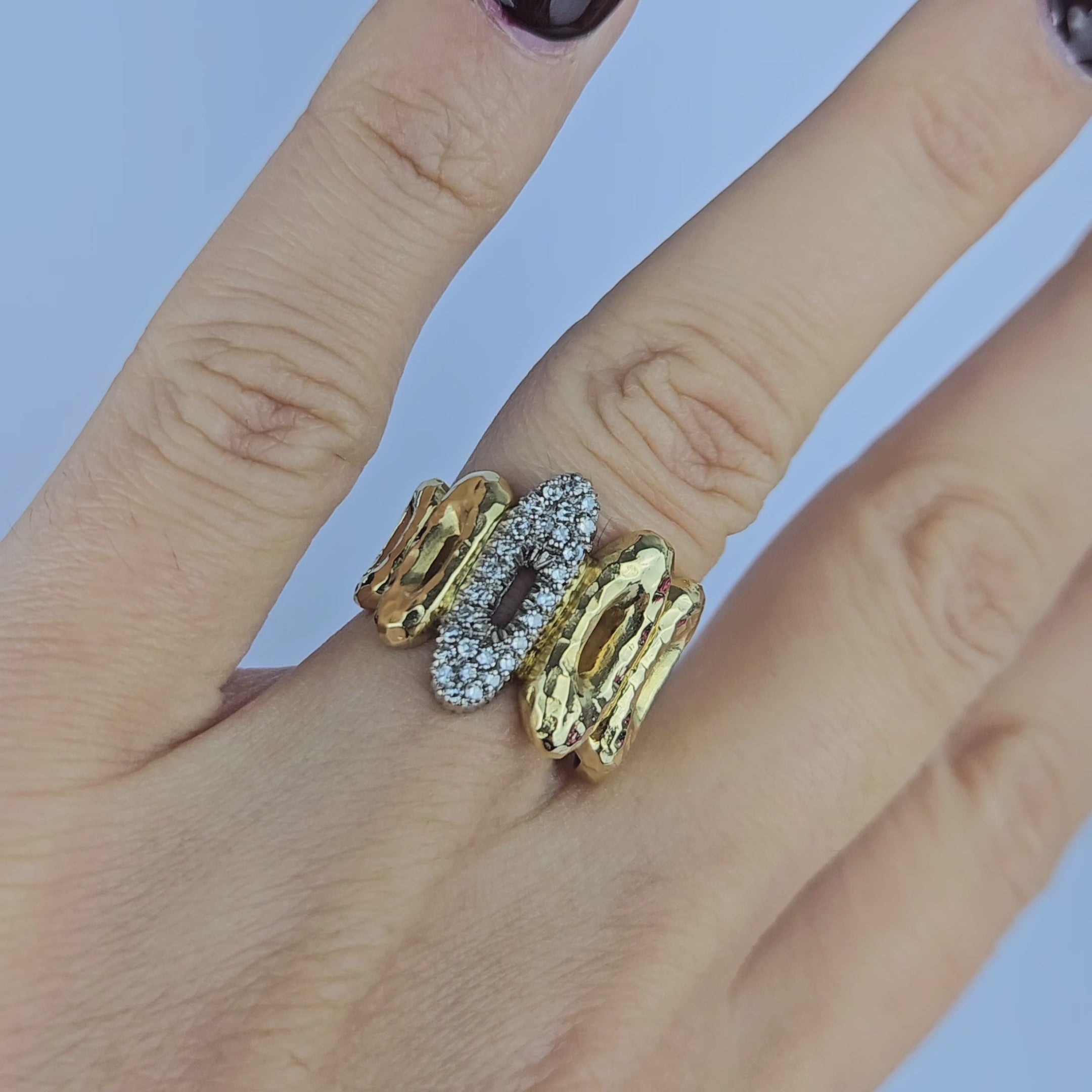 Anel de impacto em ouro amarelo 18k com elementos texturizados de acabamento martelado, dispostos em formas ovais sobrepostas. O destaque da peça é um dos elos centrais cravejado com brilhantes em pavê, criando um contraste sofisticado entre brilho e textura. A composição é ousada, artística e perfeitamente equilibrada — ideal para mulheres que valorizam design autoral e presença marcante.