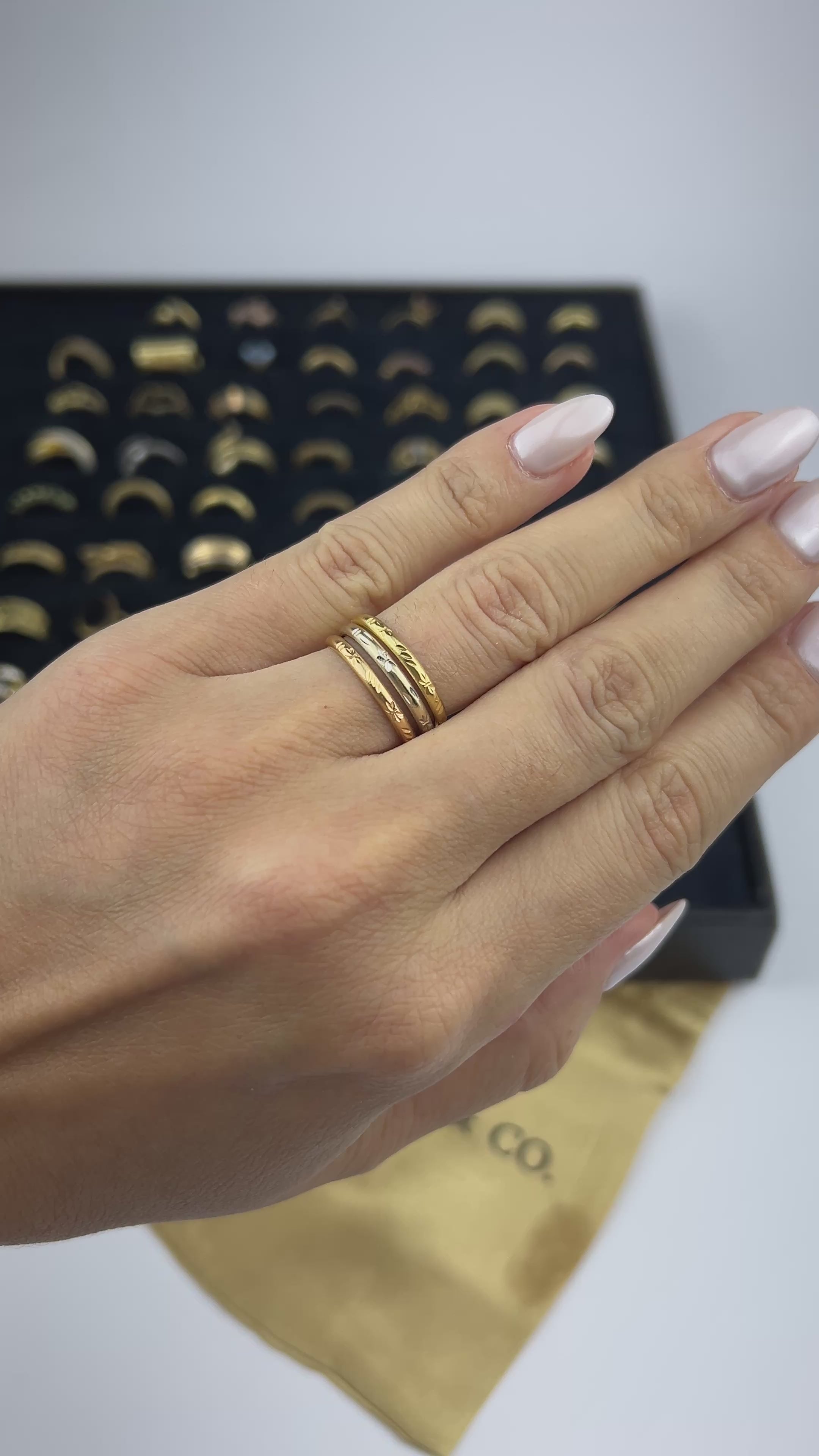 A combinação dos três tons de ouro confere sofisticação atemporal, enquanto o acabamento fosco e as gravações orgânicas reforçam a sensação de delicadeza artesanal. Uma joia com espírito simbólico e estética serena, ideal para uso diário ou como aliança de valor afetivo.