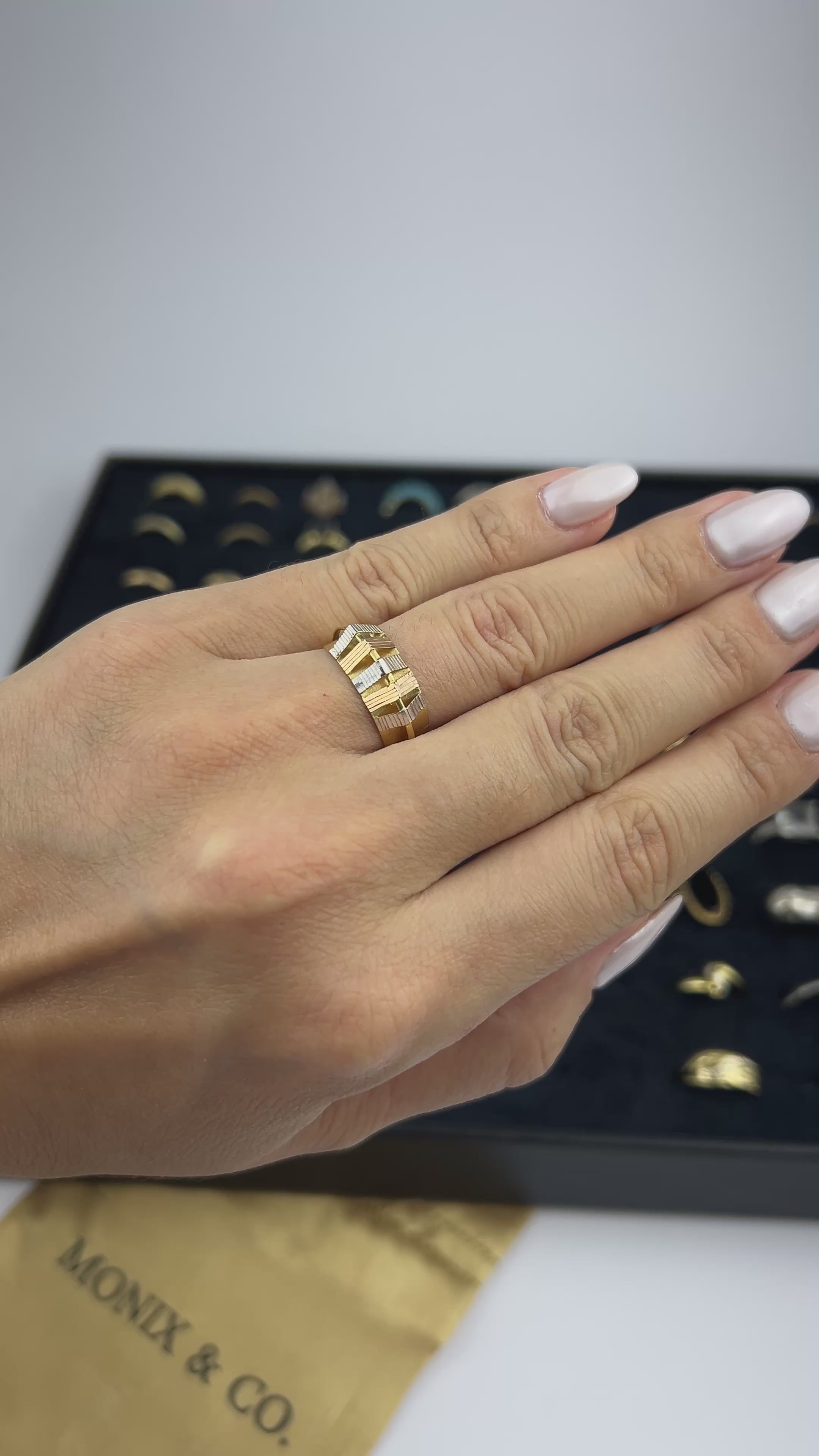Anel em ouro 18k com aro duplo e aplicação frontal de elementos verticais chanfrados, alternando ouro amarelo, branco e rosê em acabamento texturizado. O padrão geométrico e a composição simétrica criam um efeito visual dinâmico, refletindo a luz de forma única em cada ângulo.